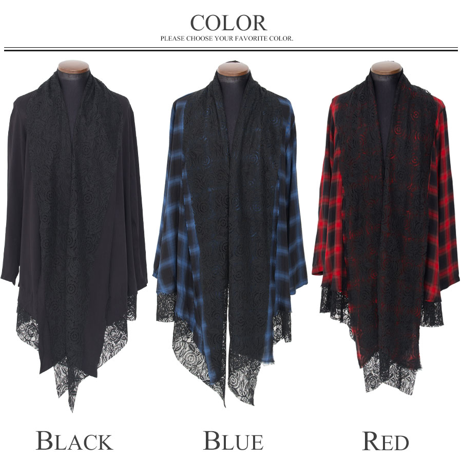 ブラック無地とレッド&ブルーのチェック3色展開になっており 外側の表地はレーヨン生地を使用し、内側のレイヤード生地にレースを 使用したデザインはレース部分がストールのような見え方。
